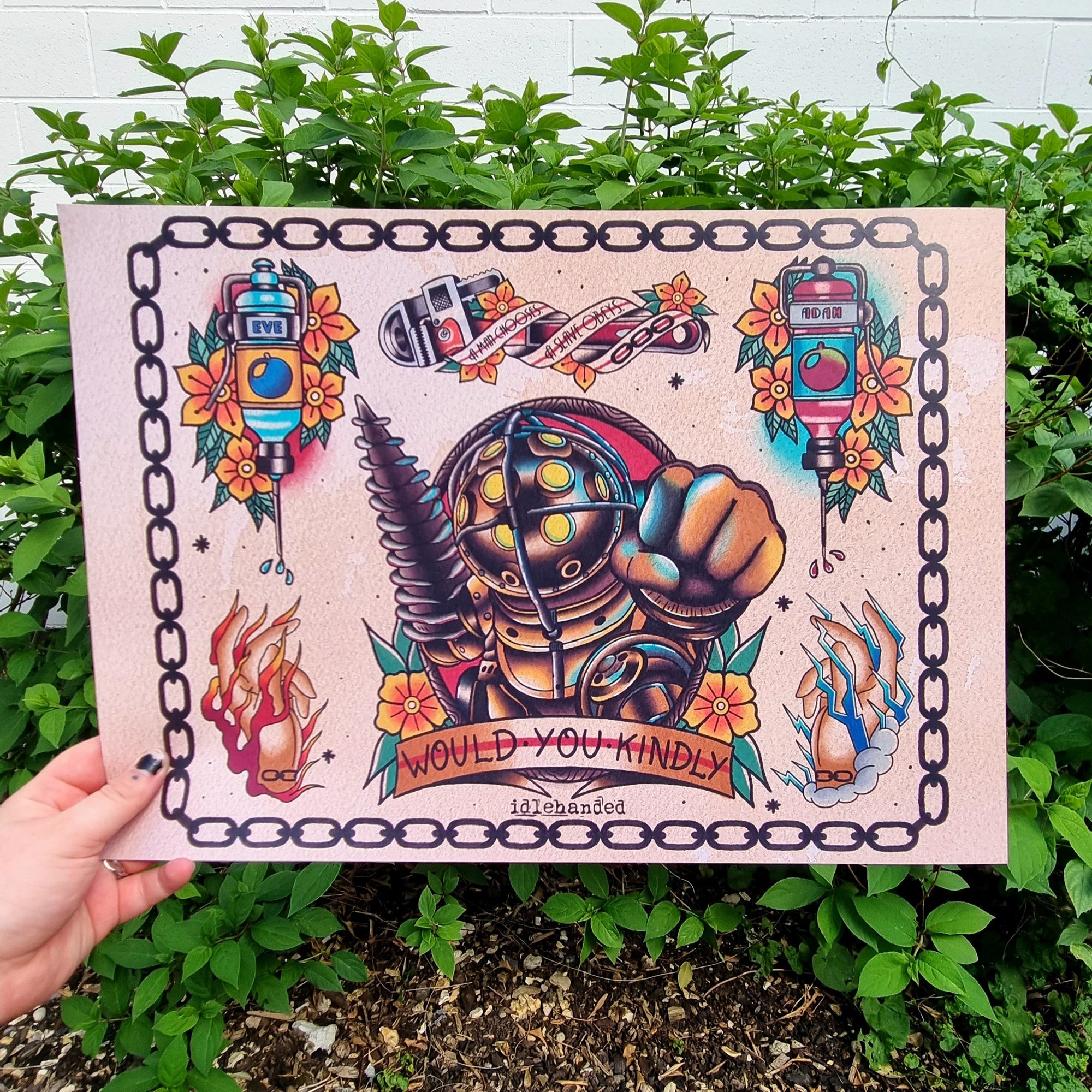 A3 flash print based on iconic imagery from the Bioshock game series.